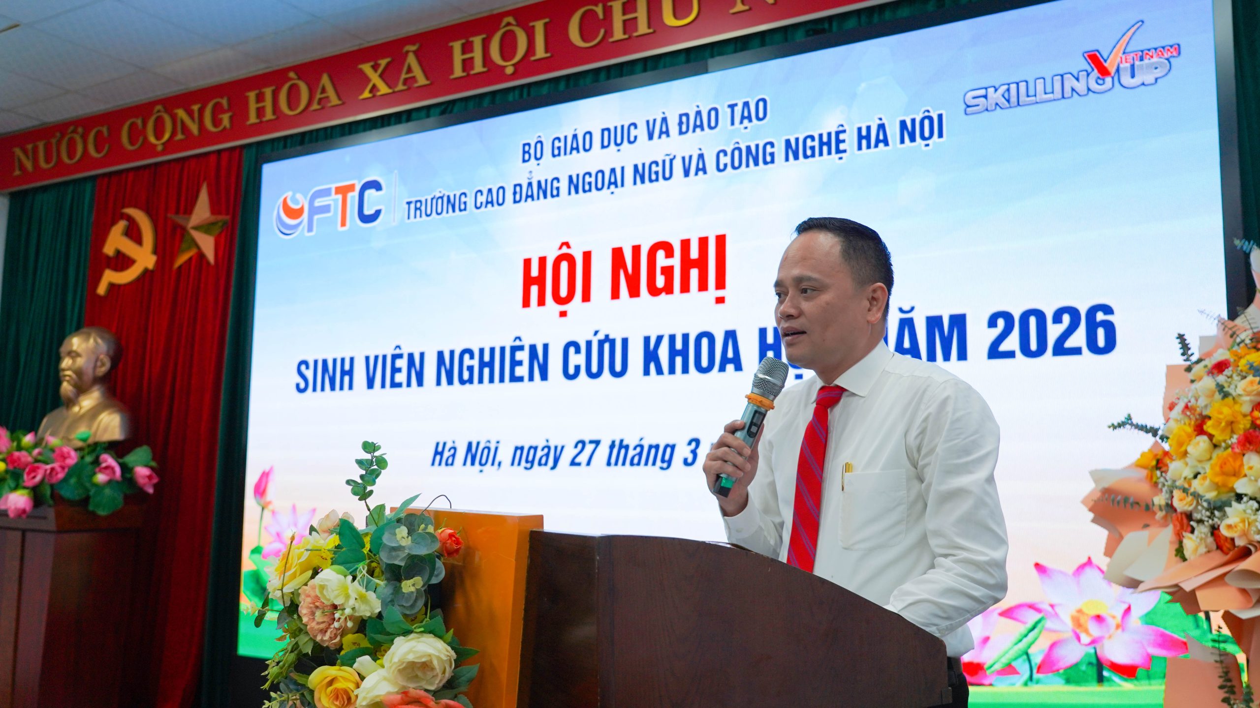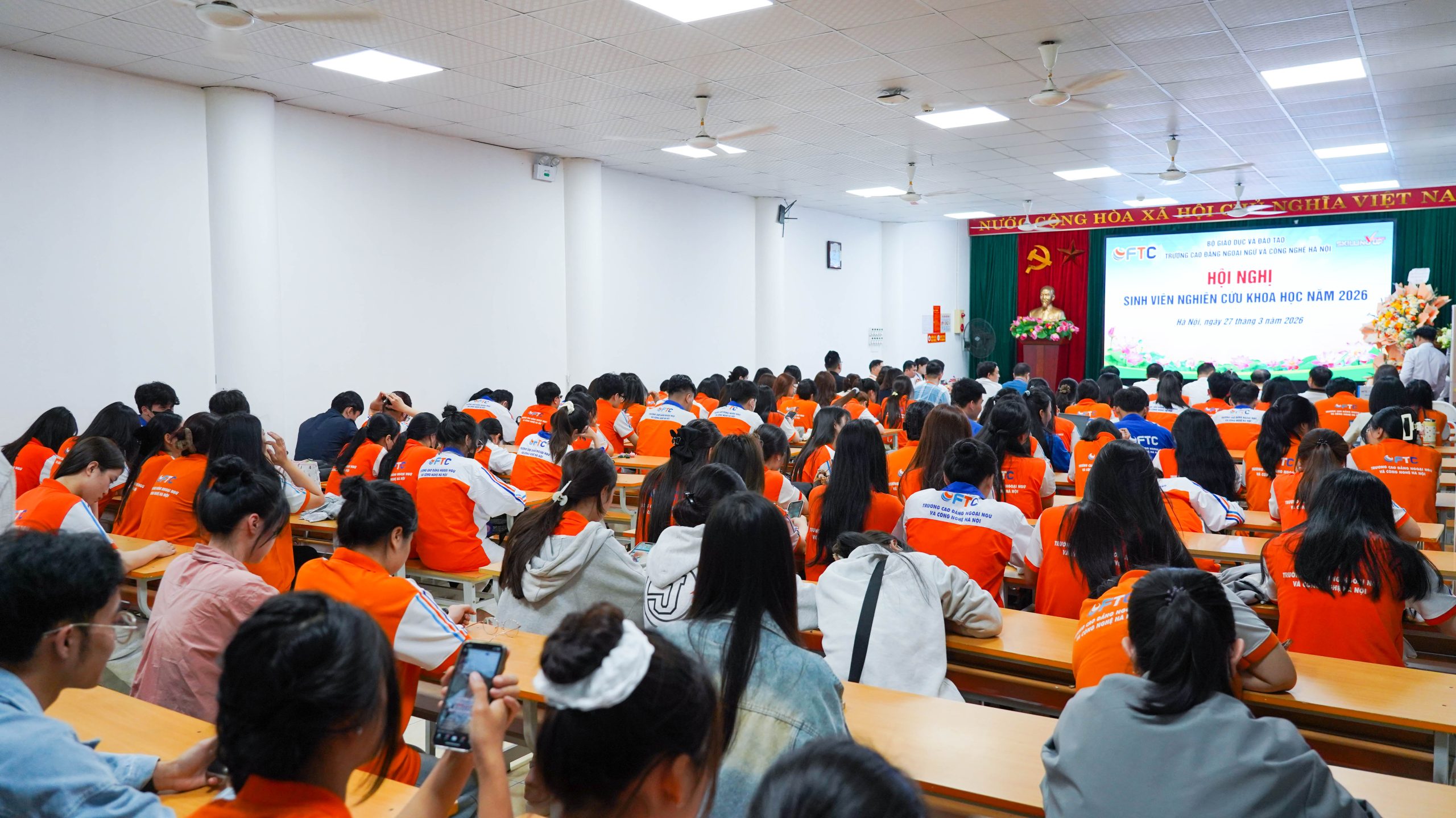 Ngày 27/3/2026, tại Trường Cao đẳng Ngoại ngữ và Công nghệ Hà Nội, Hội nghị Sinh viên Nghiên cứu Khoa học năm 2026 đã diễn ra trong không khí trang trọng, sôi nổi, thu hút sự tham gia của đông đảo cán bộ, giảng viên và sinh viên toàn trường. Đây là hoạt động học thuật thường niên có ý nghĩa quan trọng nhằm thúc đẩy phong trào nghiên cứu khoa học, khơi dậy tinh thần sáng tạo và năng lực tư duy độc lập của sinh viên.